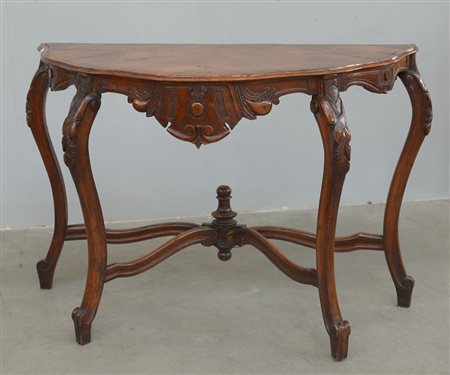 Consolle in noce di forma sagomata con fascia intagliata, gambe mosse riunite da traverse sagomate. Sec. XIX (cm 120x85x52) (difetti e restauri)