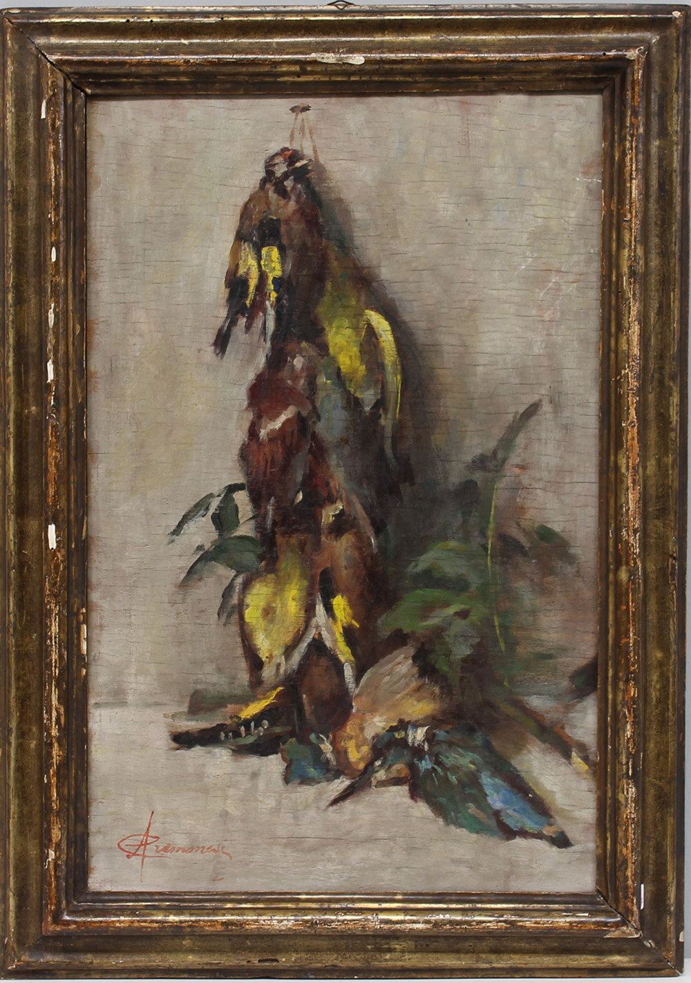 "Natura morta con selvaggina" olio su compensato (cm 53x35) firmato in basso a sinistra, in cornice (difetti)