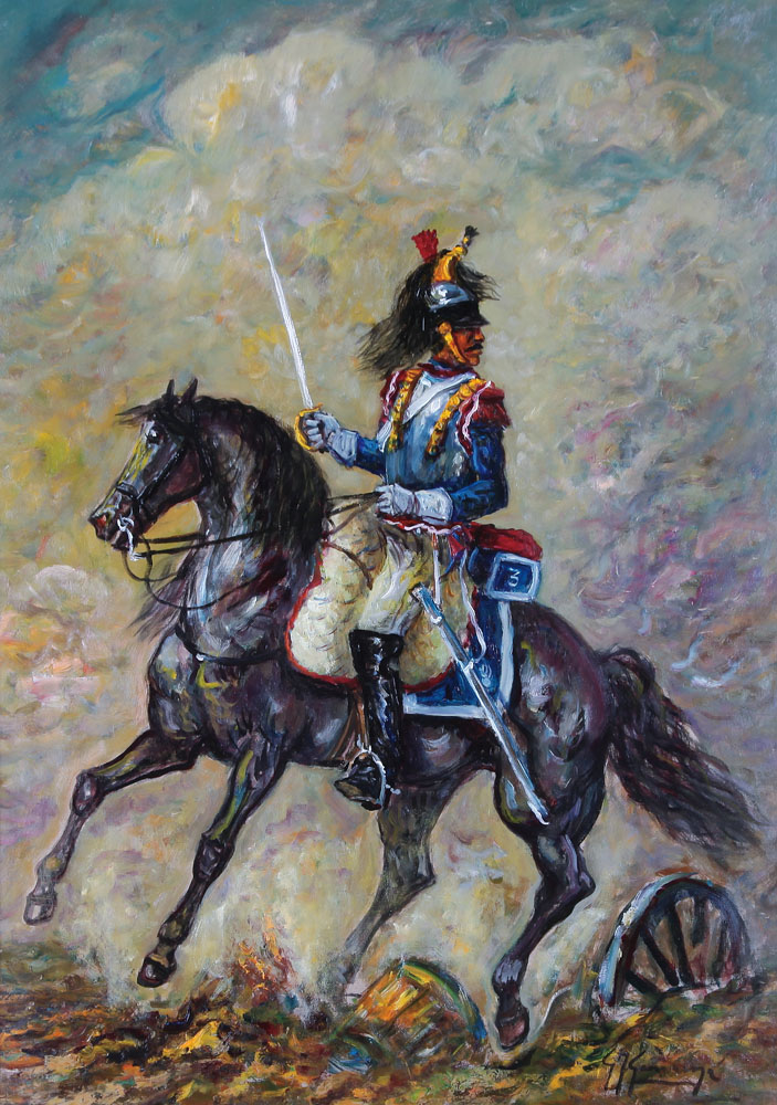 GIOVANFRANCESCO GONZAGA Milano 12/06/1921 - Milano 02/10/2007 Corazziere, 1992 olio su tela cm.70x50, firma in basso a destra, titolo, firma e anno al retro, opera registrata presso l'Archivio Generale delle Opere di Giovan Francesco Gonzaga come da dichiarazione su foto.