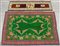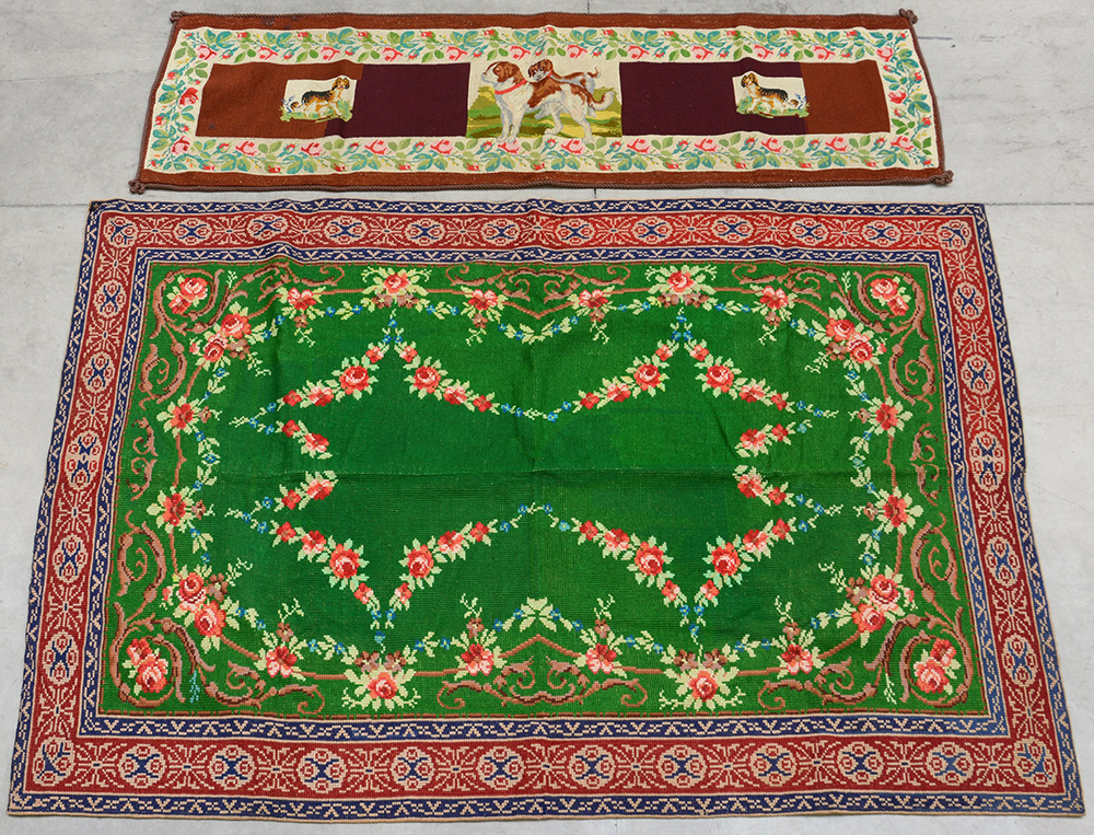 Tappeto a mezzo punto in lana di colore verde con motivi floreali unito ad un pannello decorativo a mezzo punto raffigurante cani San Bernardo, Europa, secolo XX. (cm 180x90) (difetti)