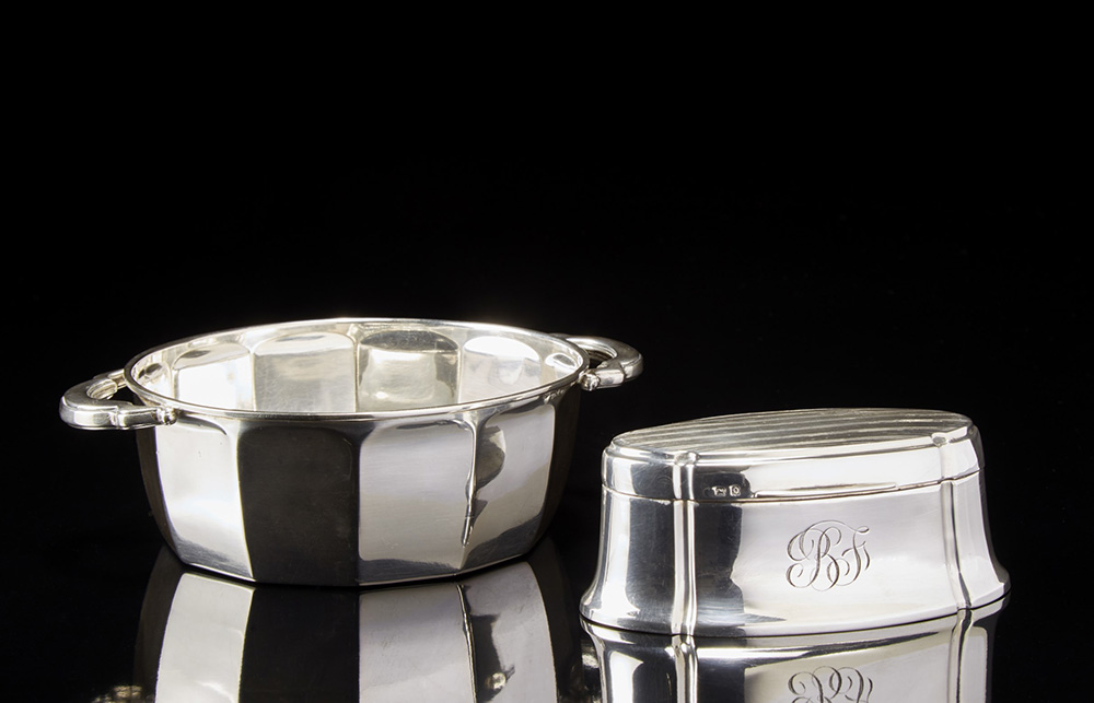 Lotto composto da una ciotola sfaccettata a due manici e una scatoletta di forma ovale in argento (gr 170 ca.) (mancanze)