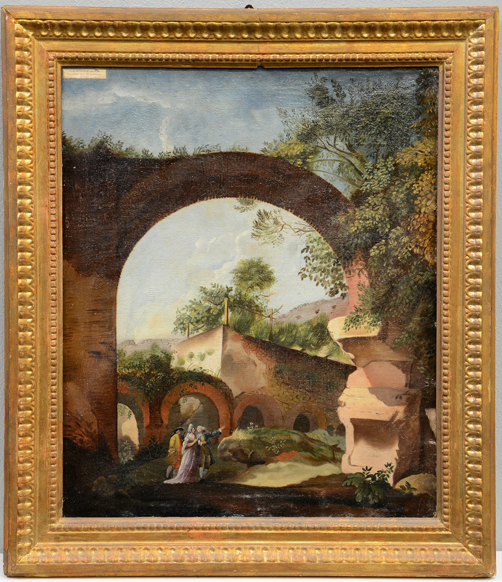Artista del secolo XIX "Paesaggio con rovine" olio su tela (cm 55x45) in cornice (difetti)