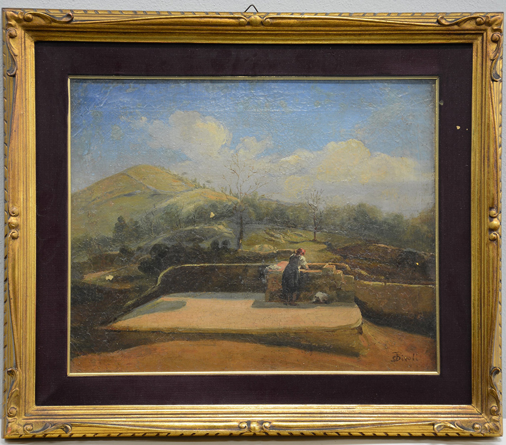 Ignoto "Paesaggio con figure" olio su tela (cm 30x40) firmato S. Tivoli in basso a destra, in cornice (difetti e mancanze)
