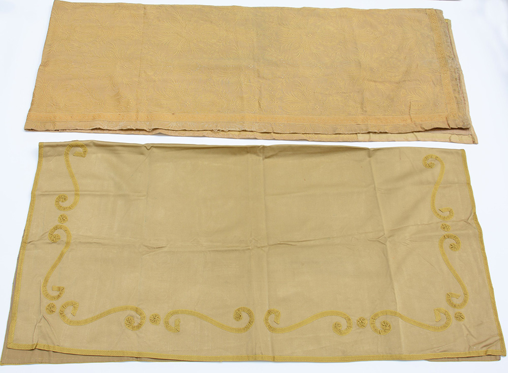 Pannello decorativo in seta canneté color oro antico, decorato con trame aggiunte in seta a motivi floreali, unito ad un tessuto decorativo in tiwelle in seta decorato con galloni e motivi a nuvole, secolo XX. (cm 136x52) (difetti)