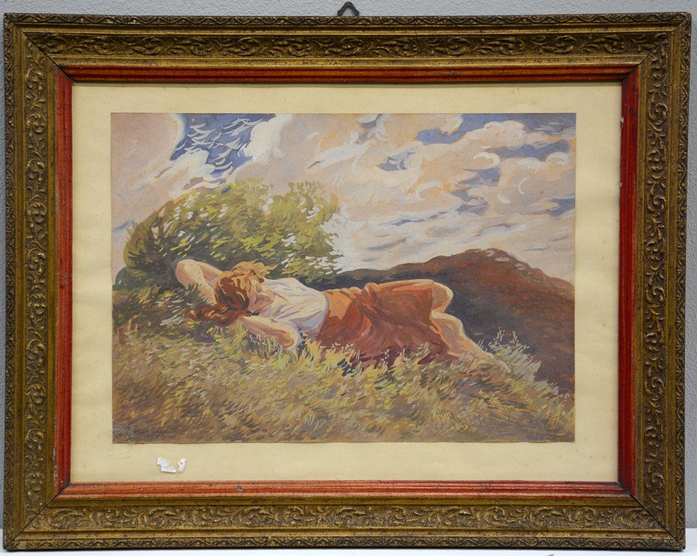 Firma indecifrata "Il riposo sull'erba" acquerello su cartoncino (cm 30x43)...