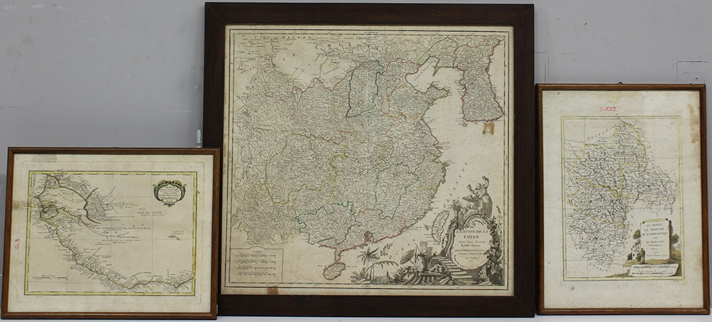 Lotto costituito da tre carte geografiche della seconda metà del ‘700 tratte da due atlanti diversi, annotate a mano, raffiguranti la Francia, le coste dell’Alta Guinea e l’Impero Cinese (lievi difetti). Misure diverse in cornici disomogenee.