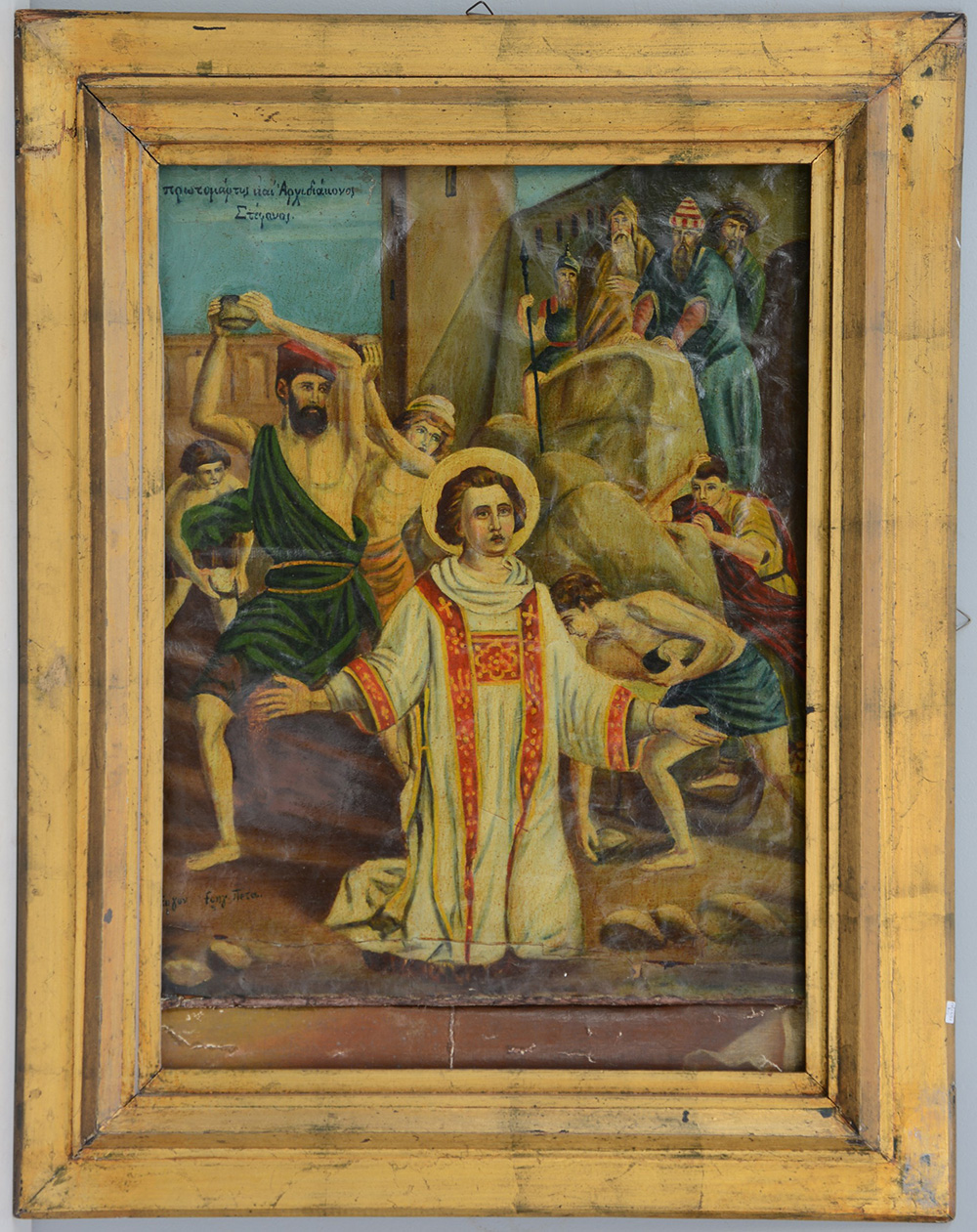 Scuola greca sec XIX "Martirio di santo" olio su tela applicata su compensato (cm 70x50) iscritto in alto e in basso a sinistra, in cornice (gravi difetti)