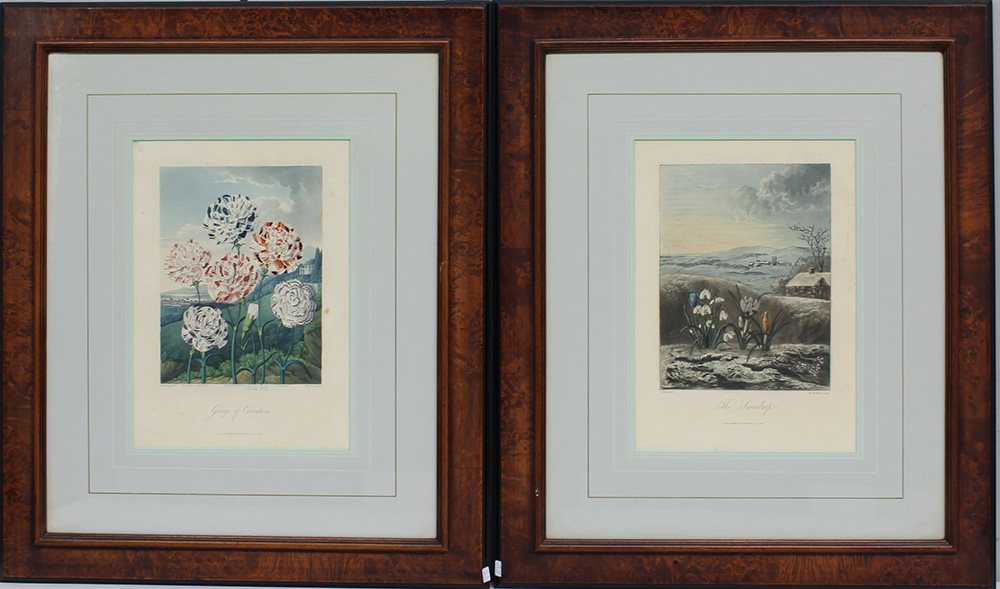 Lotto composto da due tavole a colori (battitura cm 34 x 24) tratte dall’opera “Temple of Flora” di Thorton pubblicata a Londra nel 1812. In cornici omogenee.