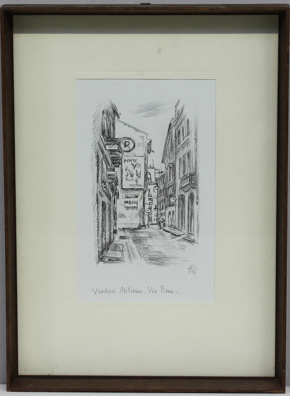 "Vecchia Milano, via Fieno" disegno a matita su carta (cm 23x15) firmato in basso a destra, in cornice. Etichetta al retro della società per le belle arti ed esposizione permanente, via Turati 34 Milano - giugno/luglio 1970