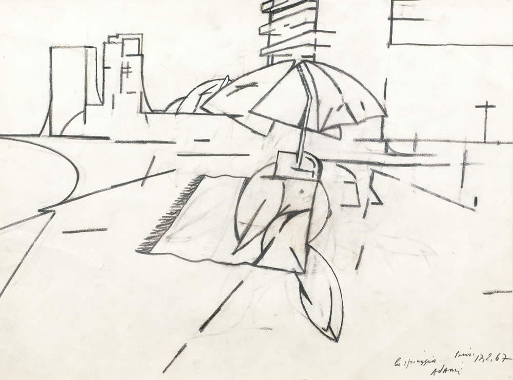 VALERIO ADAMI Bologna 17/03/1935 La spiaggia, 1967 matita su carta cm. 33,5x44, firma, titolo, anno e località (Paris) in basso a destra, etichetta della Galleria De' Foscherari (BO) al retro, dichiarazione d'autenticità dell'artista su foto.