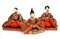 Manifattura giapponese, lotto di tre figure con teste in legno intagliato, abiti in tessuto ed elementi decorativi in metallo (difetti e mancanze)