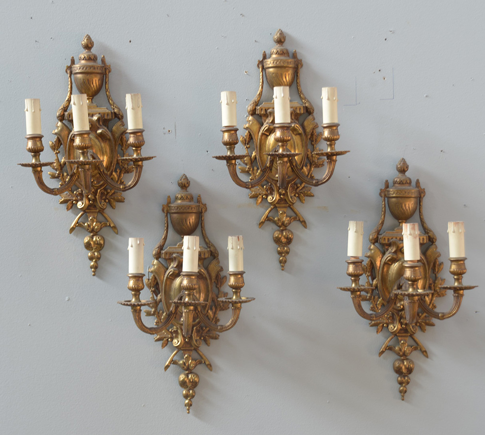 Gruppo di quattro aplliques a tre fiamme in bronzo dorato e cesellato a motivi vegetali, vaso e festoni (h cm 40) (difetti)