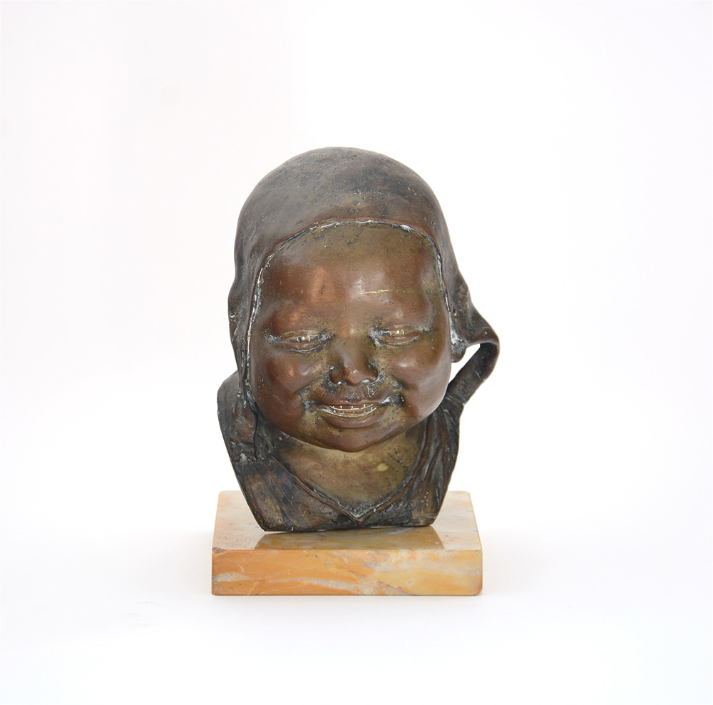 Firma indecifrata "Testa di bimbo sorridente con copricapo" scultura in bronzo su base in marmo, firmata al retro (h cm 20)