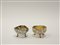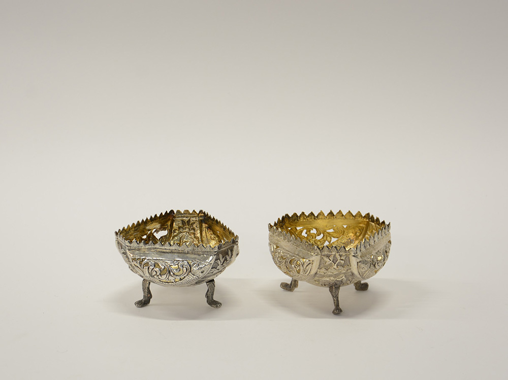 Coppia di alzatine tripodi in metallo argentato e sbalzato a motivi animali (lievi difetti)
