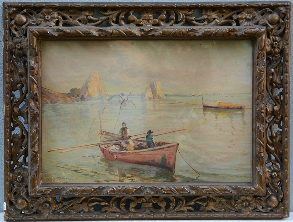 Lotto 2095 | Firma indecifrata "Paesaggio marino con barche e pescatori" olio su cartone...