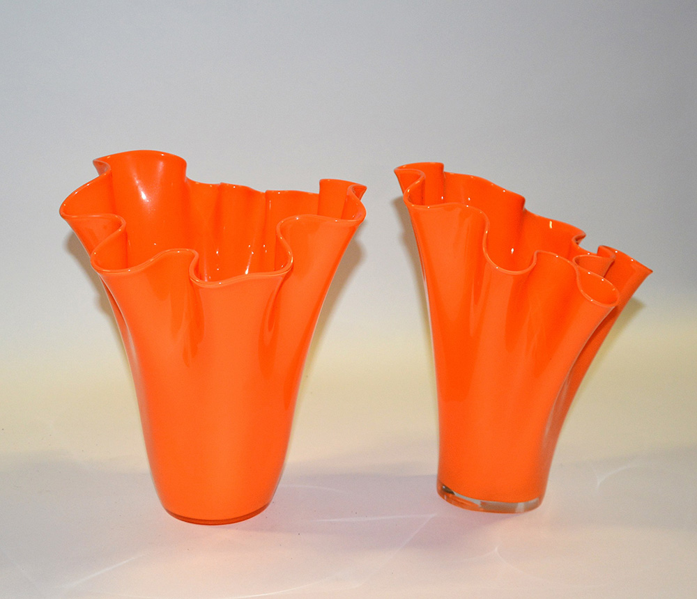 Lotto composto da due vasi a fazzoletto in vetro opacizzato arancio (h max cm 31,5)