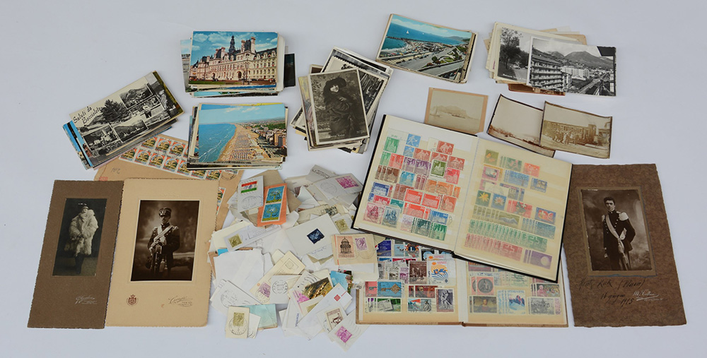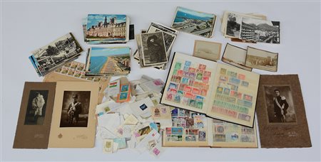 Scatola contenente numerose cartoline, alcuni francobolli e foto d’epoca...
