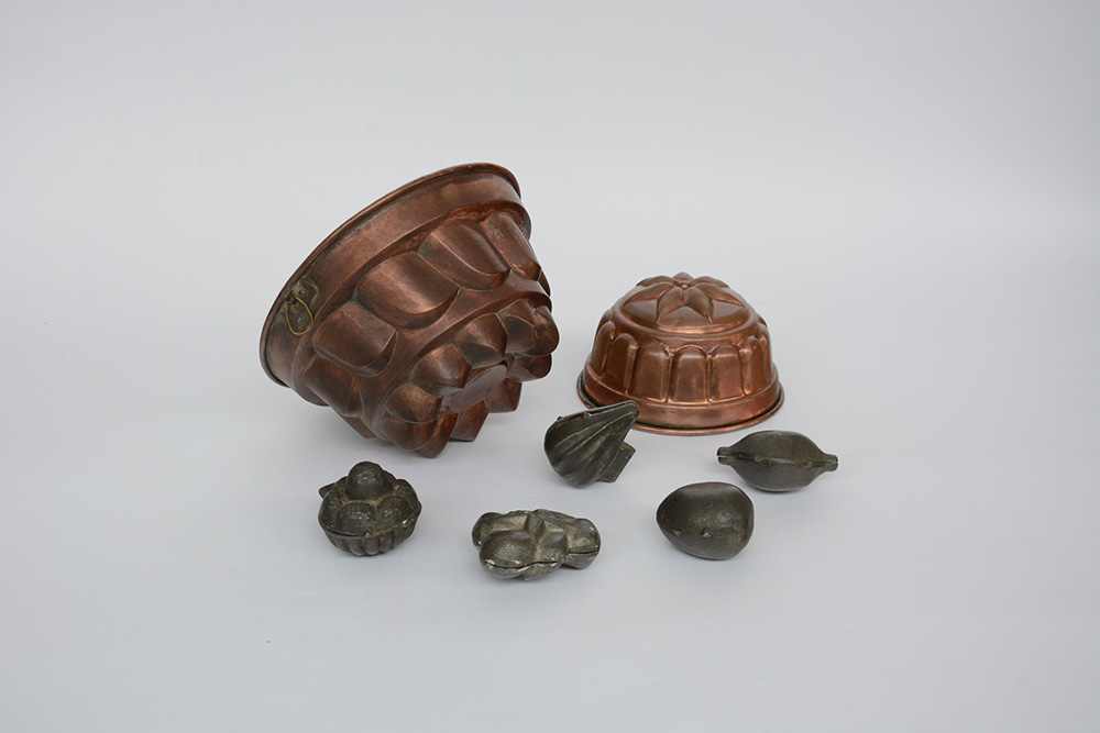 Lotto composto da due forme di budino in rame e cinque stampini in metallo a...