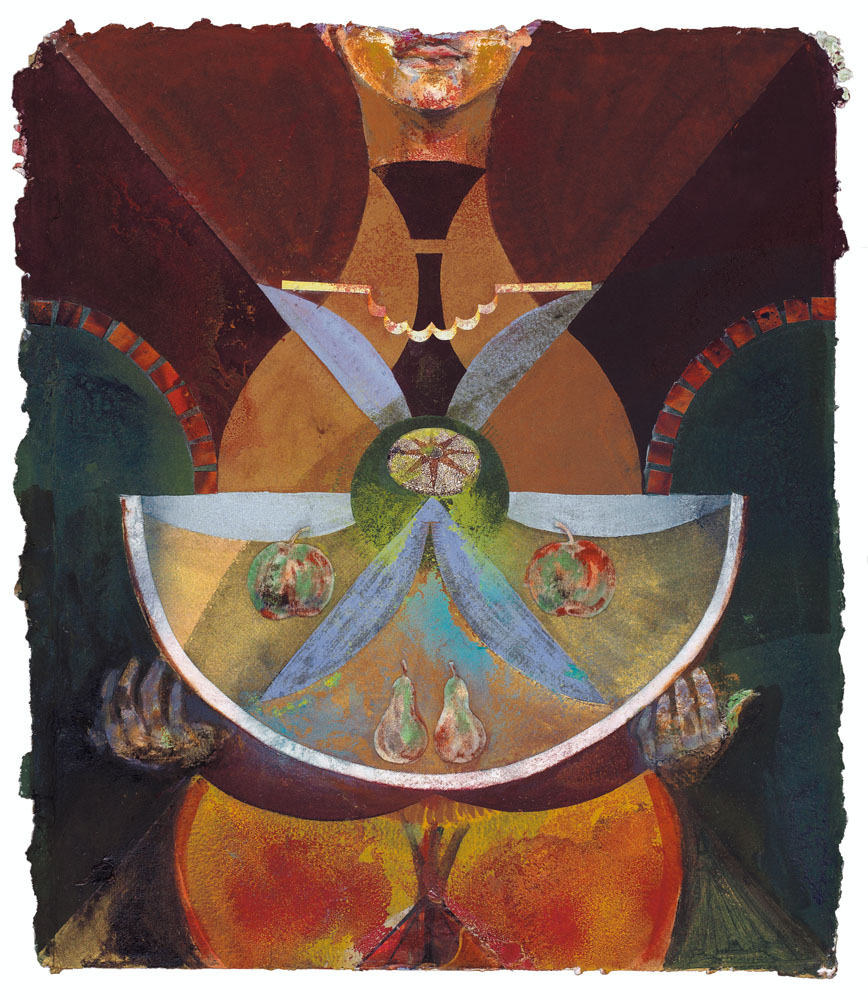 BRUNO CECCOBELLI Montecastello Vibio (Pg) 02/09/1952 Natura viva, 1999 tecnica mista e collage su carta a mano cm. 70x61, firma, titolo e anno al retro (coperti da cartoncino), fotografia allegata ritraente l'artista con l'opera.