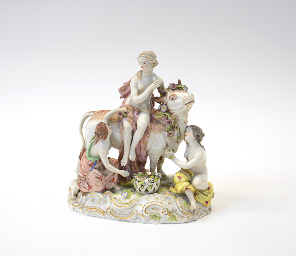 Manifattura di Vienna "Ratto d'Europa gruppo plastico in porcellana policroma (cm 21x23) (mancanze e restauri)