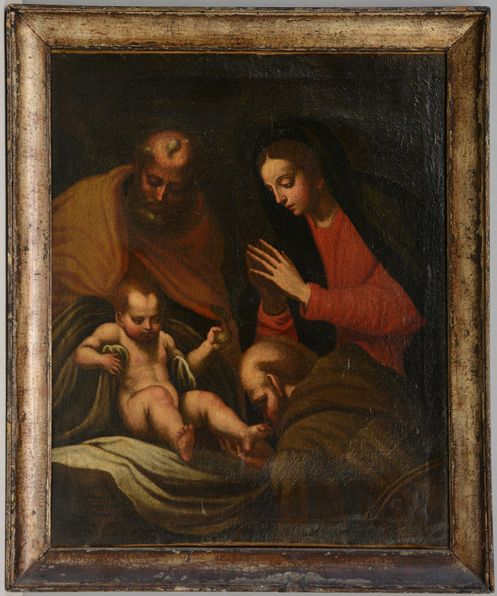Scuola emiliana del secolo XVII "Sacra Famiglia con San Francesco" olio su tela (cm 82,5x68)in cornice antica (difetti e restauri)