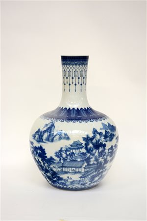Manifattura Cina, vaso a collo stretto in porcellana bianca e blu decorato a paesaggi, sec. XX (h cm 56)(lievi difetti)
