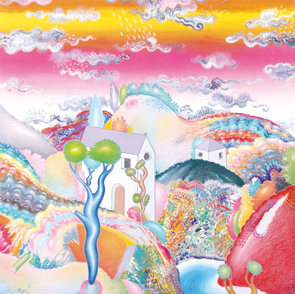 LUCA ALINARI Firenze 27/10/1943  Alberi e case, 1996  olio e tecnica mista su tela applicata su tavola cm. 60x60, firma in basso a sinistra, dichiarazione d'autenticità dell'artista e Archivio Fotografico Generale delle Opere di Luca Alinari numero A-6-S su foto.