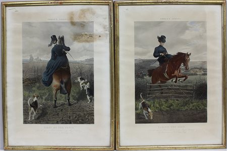 Lotto composto da due incisioni a colori (cm 56,5x40) raffiguranti una scena di caccia con nobildonna a cavallo (umidità e fioriture). In cornici omogenee (difetti).
