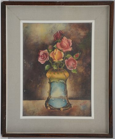 "Vaso con fiori" olio su tela (cm 40x30) firmato in basso a destra, in cornice (difetti)