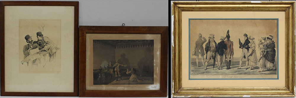 Lotto composto da tre incisioni a colori di soggetto e dimensioni differenti (difetti). In cornici disomogenee.