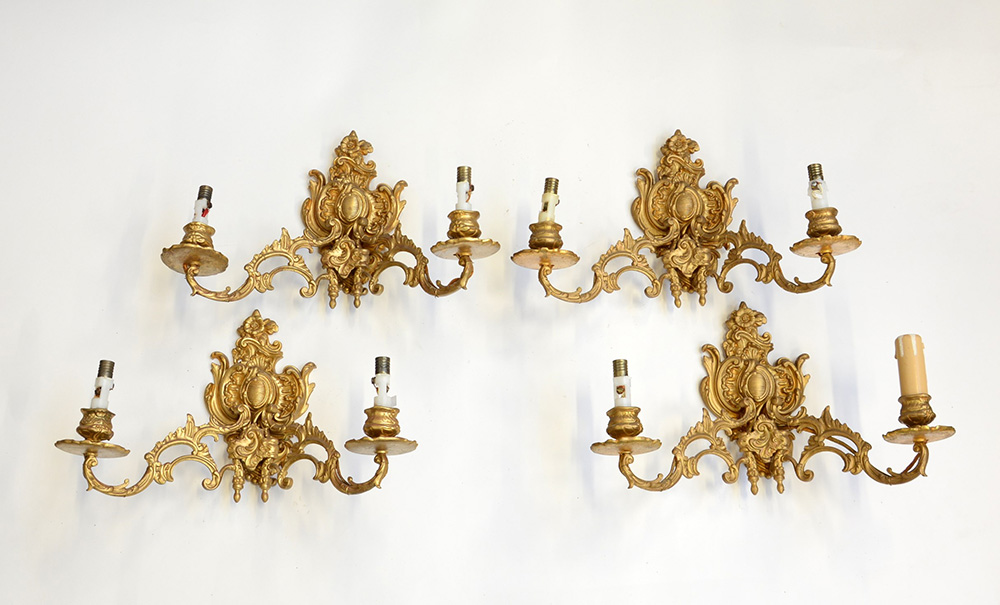 Quattro appliques in metallo dorato decorati in rilievo a fregi, fiori e...