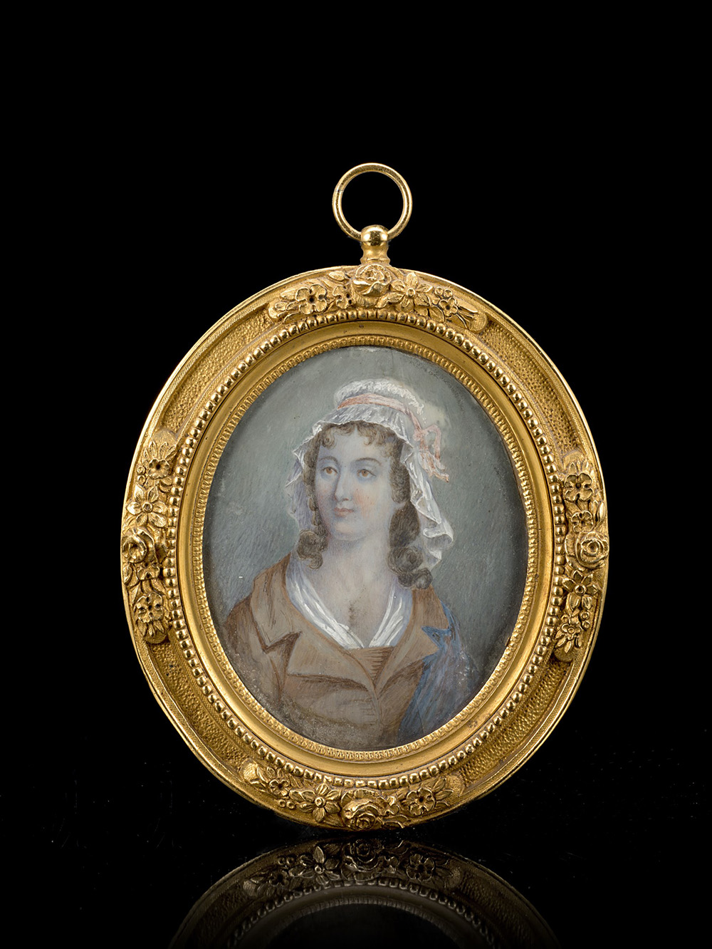 Early 19th-century school "A Lady wearing a bonnet" oval miniature on ivory (cm 10x7,5) Framed (defects and restorations)