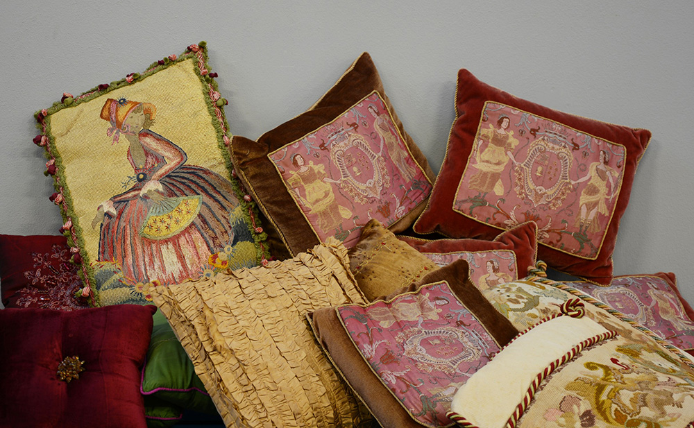 [Tappeti] Lotto di due cartoni contenenti varie coperture per cuscini di tessuto in velluto e passamaneria, ricami in piccolo punto e mezzo punto a decoro floreale in stile seicentesco in varie misure (difetti)