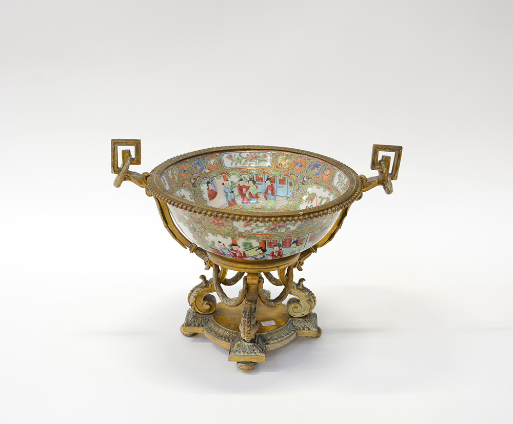 Manifattura Cina, ciotola in porcellana policroma decorata a fiori in metallo dorato (d cm 24, h cm 25)