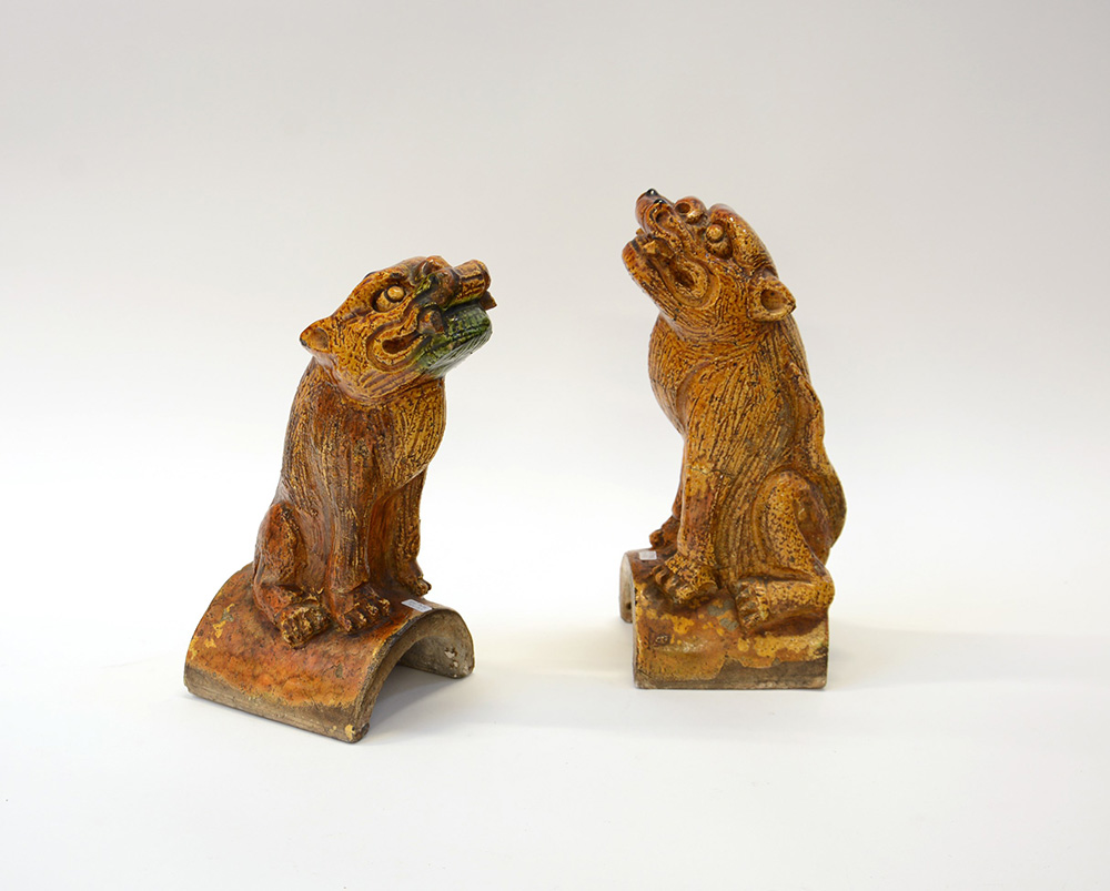 Due copritegole in ceramica policroma a forma di cani di Pho, misure diverse (lievi difetti)
