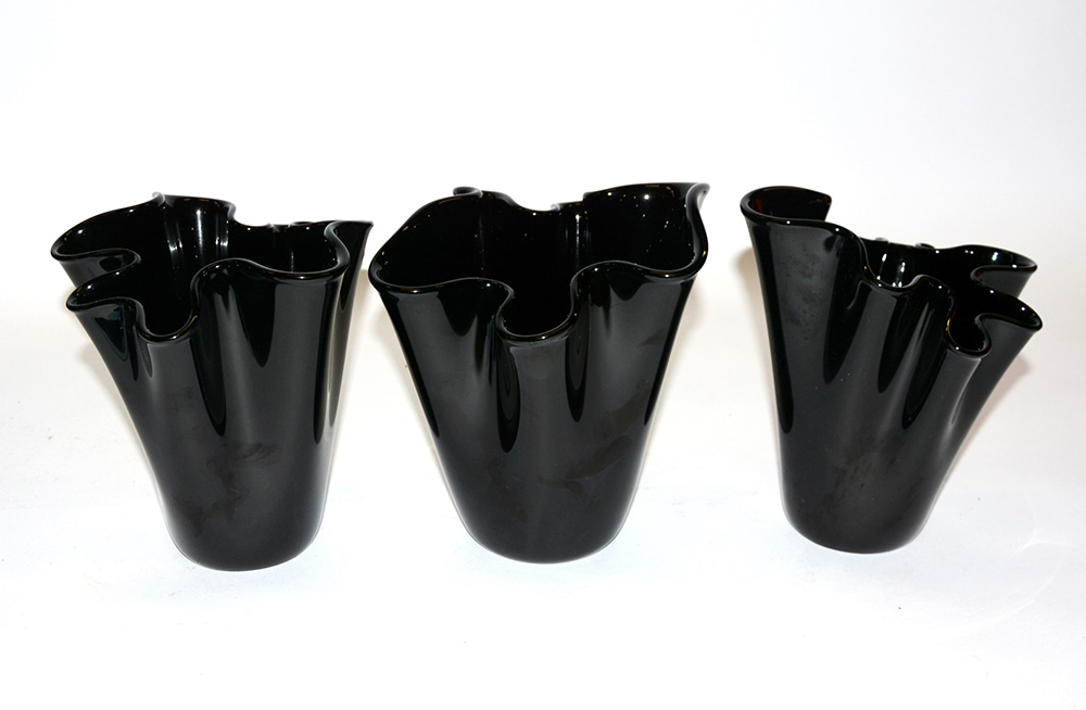 Lotto composto da tre vasi a fazzoletto in vetro opacizzato nero (h max cm 21)