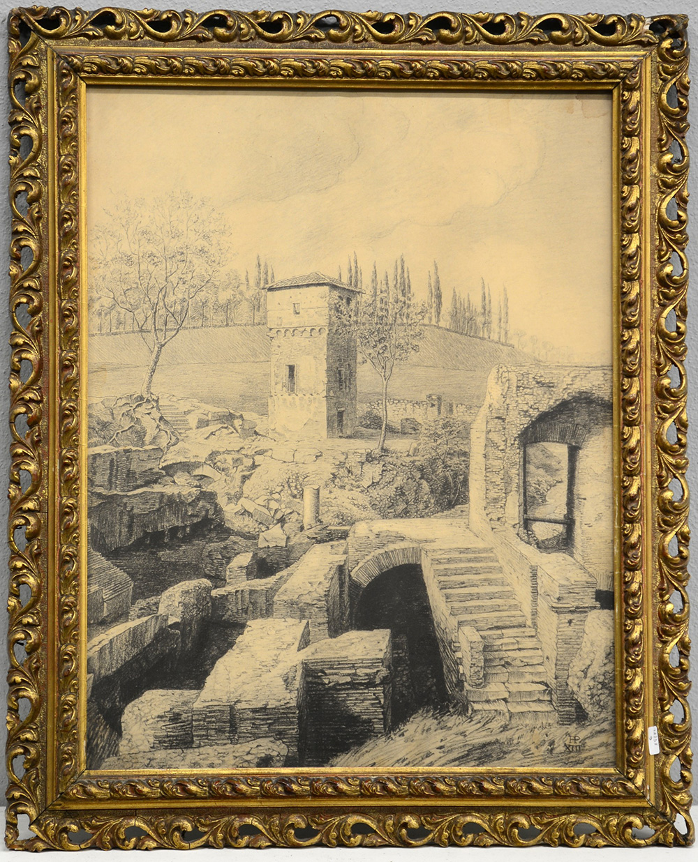 Ignoto "Paesaggio con torre" matita su carta (cm 40x30) siglato P.P. e datato XIII in basso a destra, in cornice