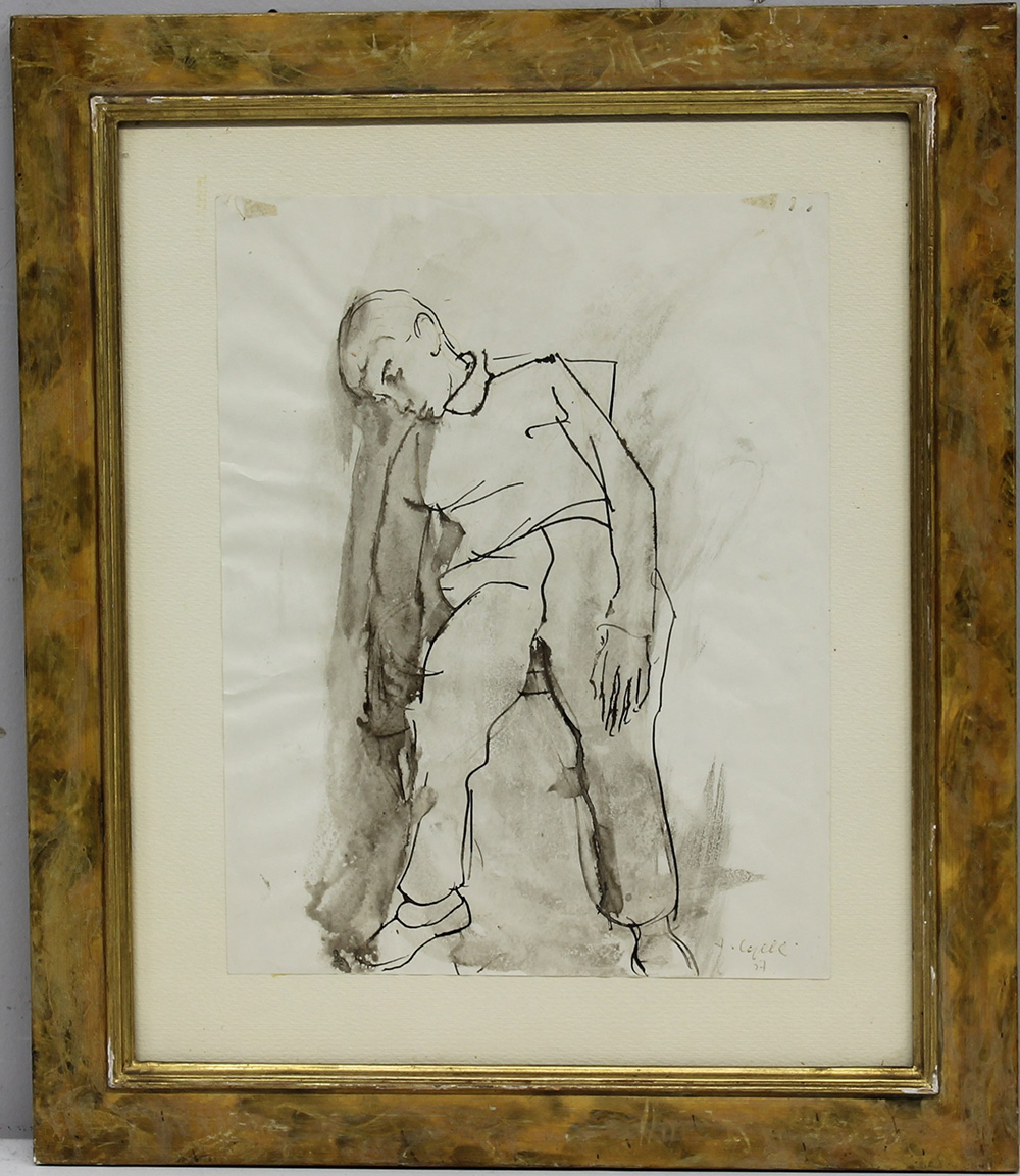 Firma indecifrata "Adolescente seduto" disegno a china su carta (cm 29x22) firmato in basso a destra e datato 1957, in cornice (difetti)
