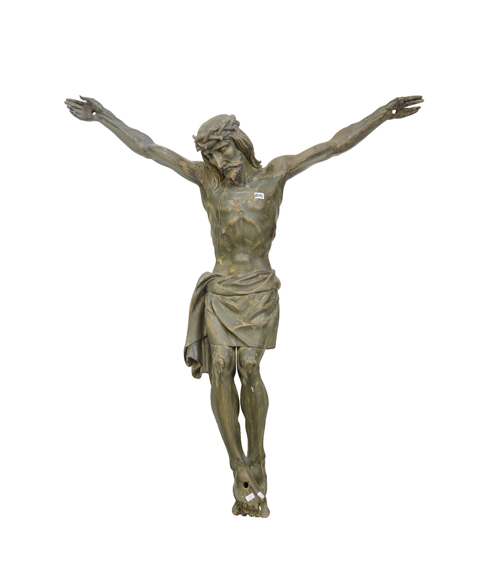 Antica scultura in legno intagliato raffigurante Cristo crocifisso (h cm 105) (difetti e mancanze)