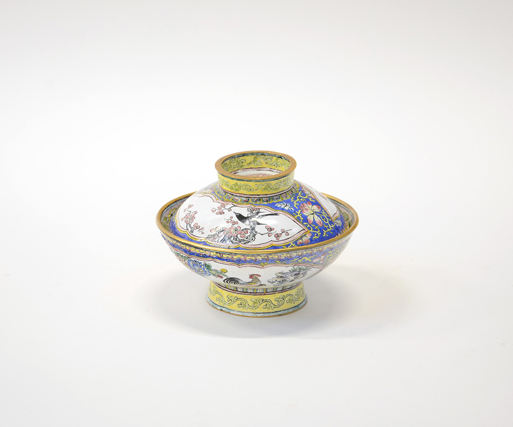 Manifattura Cina, ciotola con coperchio in metallo cloisonnè decorato a fiori...