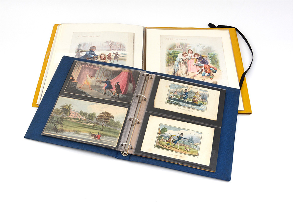 Lotto composto da cartoline antiche, biglietti e piccole incisioni di cui alcune a colori. in due raccoglitori.