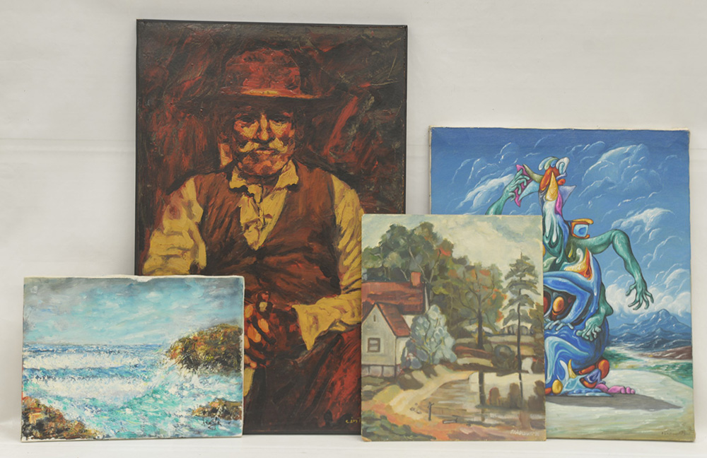 Lotto composto da quattro dipinti di autori soggetti e tecniche diverse (difetti)