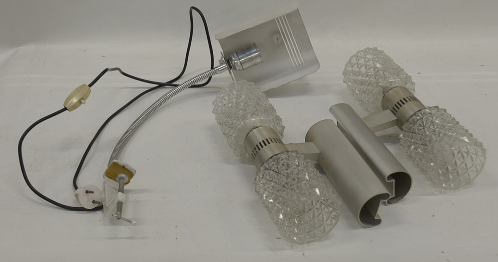 Lotto composto da due aplliques a due fiamme, una lampada da scrivania in vetro, sec XX