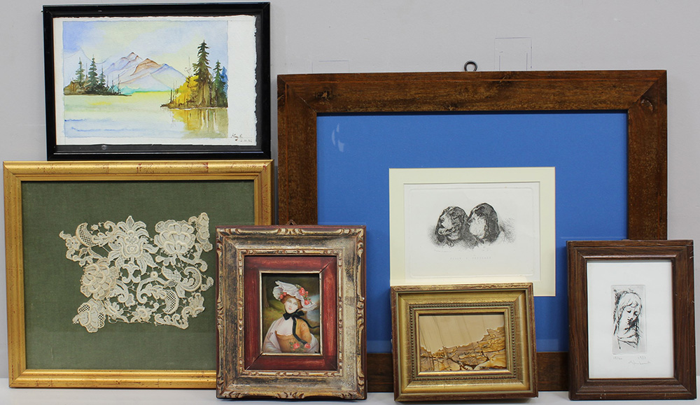 Lotto composto da sei cornici contenenti due stampe, un fossile, un ricamo, una miniatura ed un acquarello. Misure diverse (difetti)
