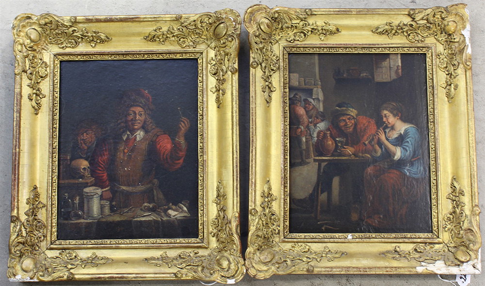 Scuola fiamminga sec. XIX "Scena di osteria" e "Dentista" coppia di olii su tavola (cm 25x20) in cornici in legno e pastiglie dorate (difetti e mancanze)