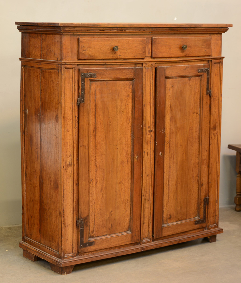 Antica credenza in noce a due ante con ripiani interni, due cassetti nella parte superiore (cm 134x145x37) (difetti)