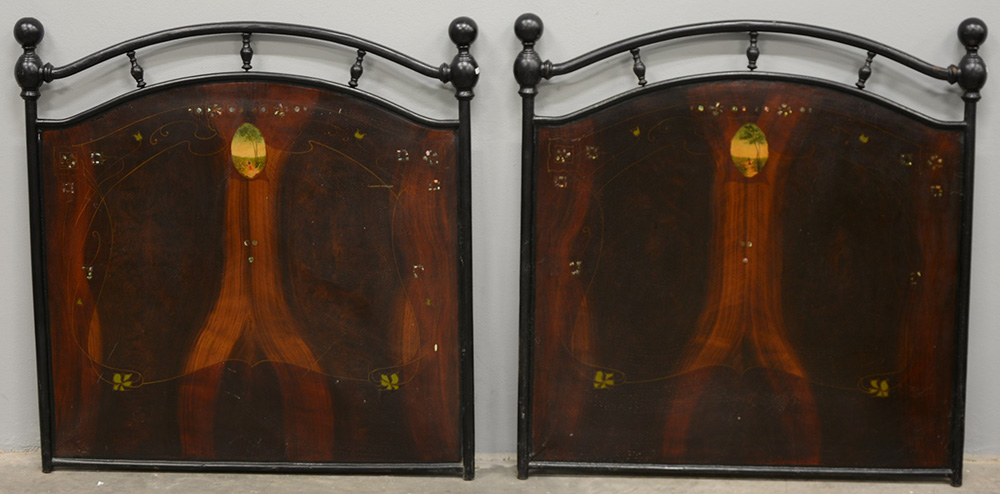 Letto Liberty a una piazza in ferro battuto con testiera e pediera dipinte con decori floreali e piccoli inserti in madreperla, mancanti delle traverse (difetti)