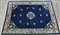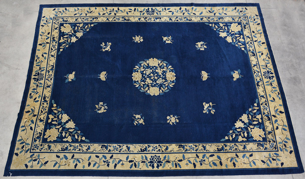 Disegno con tondo centrale decorato con rami fioriti bei toni del bianco, beige, azzurro e blu su campo blu Cina cosparso di rami fioriti e farfalle. Bordura a meandri su fondo panna (cm 349x276) (difetti e restauri)
