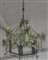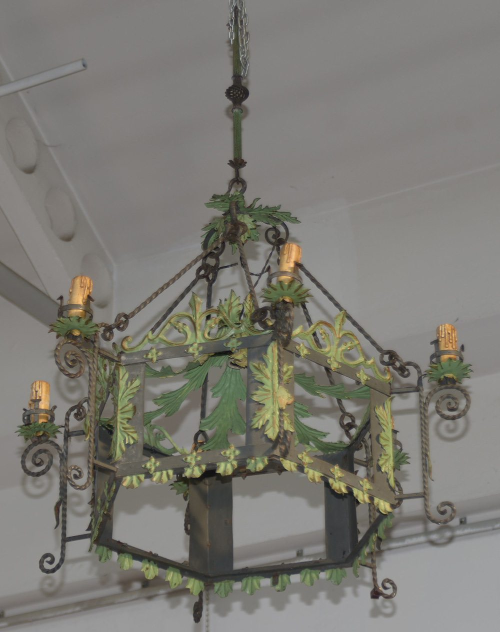 Laterna esagonale a sei luci in ferro battuto a riccioli e metallo laccato decorato a motivi vegetali (h cm 120)(difetti)
