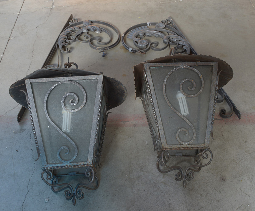 Coppia di lanterne con supporto in ferro battuto decorate a rioccoli e volute (h cm 150)(difetti)